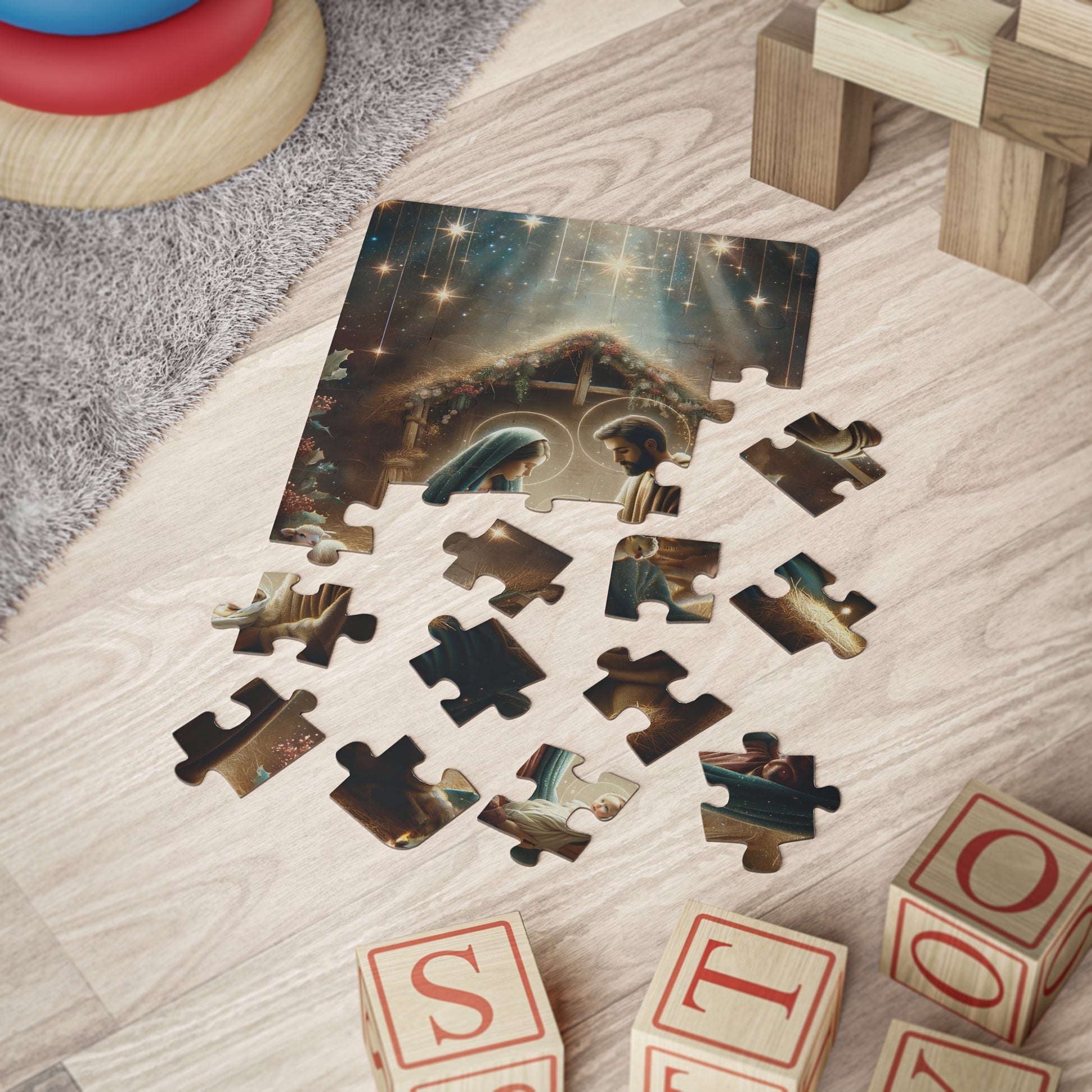 Bring the story of Christmas to life with this beautiful Nativity Scene Kids’ Puzzle. Featuring a gentle, radiant image of Mary, Joseph, and Baby Jesus beneath the Bethlehem star, this puzzle captures the peace and wonder of the Holy Night — a perfect way for children to learn, play, and reflect on the true meaning of the season.