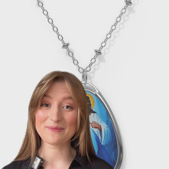 This oval (ellipse) pendant necklace carries quiet reverence and everyday wearability. The Divine Mercy image shines in vibrant colors on a glossy zinc surface, luminous against your skin and built to stay brilliant over years of daily wear. Crafted from durable zinc-alloy, the pendant and chain feel substantial yet remain light enough to wear from morning prayer to evening rest. The gentle teardrop silhouette frames the artwork beautifully, perfect for layering or wearing alone, while the secure lobster-clasp closure keeps it safely in place. Slip it into daily routines—prayer corners, morning walks, or tucked beneath a sweater—and let it add a subtle, meaningful note to how you move through the day.
