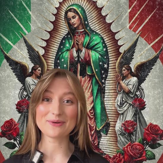 Wrap yourself in warmth, comfort, and faith with this luxurious Crushed Velvet Blanket inspired by Our Lady of Guadalupe. Featuring a vivid, vintage-inspired image of Our Lady surrounded by roses and guardian angels, this blanket beautifully blends Mexican heritage, devotion, and artful design into a piece you’ll cherish for years.